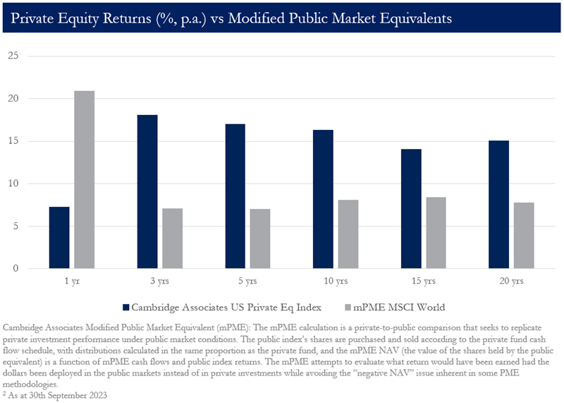 The upshot is that the average retail investor isn't getting a representative slice of the economy through passive investing anymore, and they risk missing out on superior returns as a result. Indeed, research shows that private equity returns have significantly outperformed public markets over almost every time horizon as illustrated below: