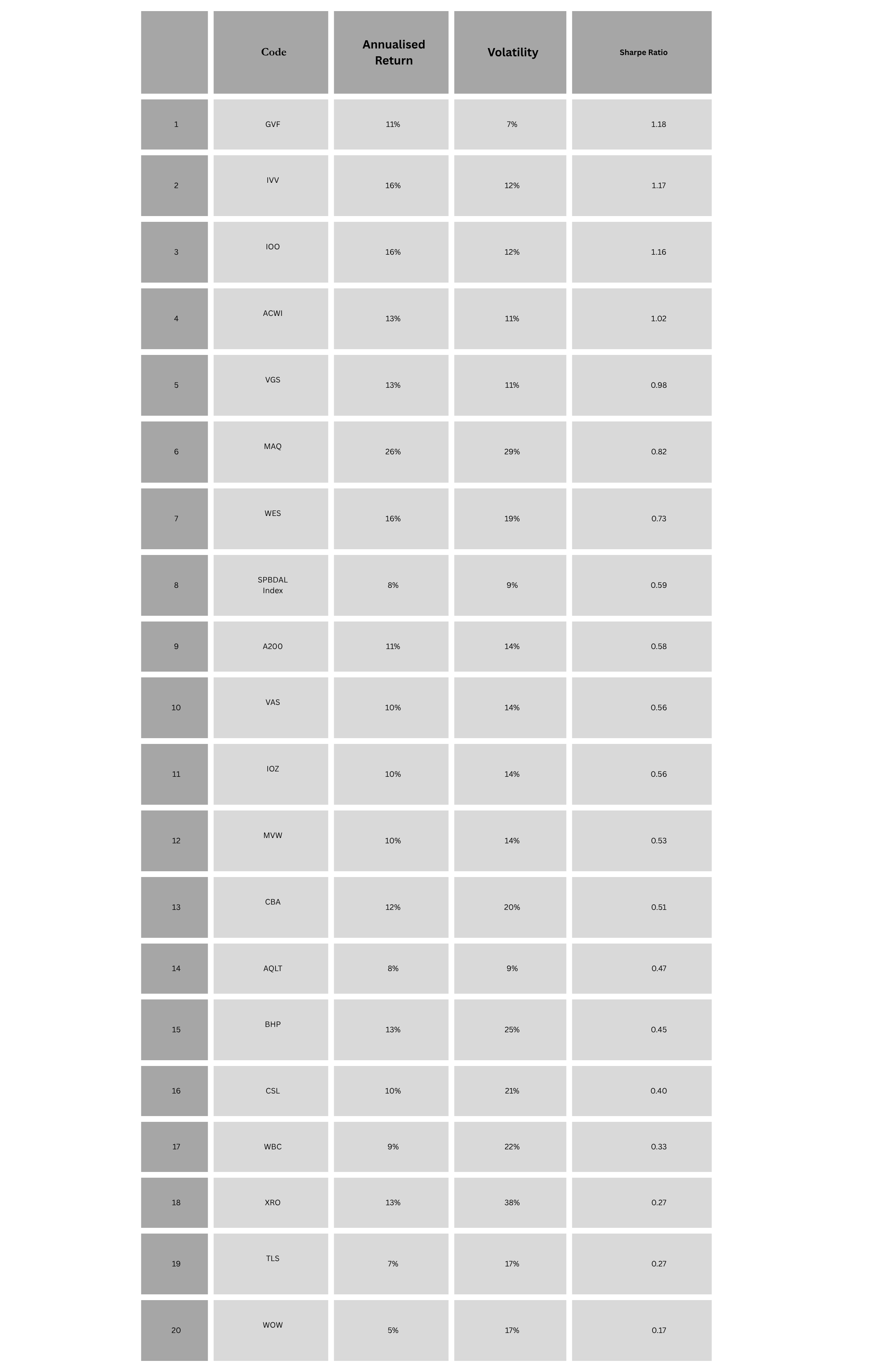 Below is a table showing the annualised returns, volatility and corresponding Sharpe Ratios for a range of popular Australian investments — many of which were referenced in the original Firstlinks article.